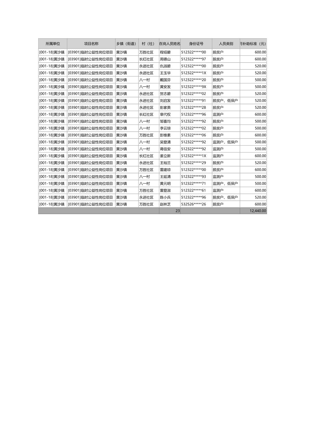 黄沙镇2023年临时性公益岗位补助情况公示表