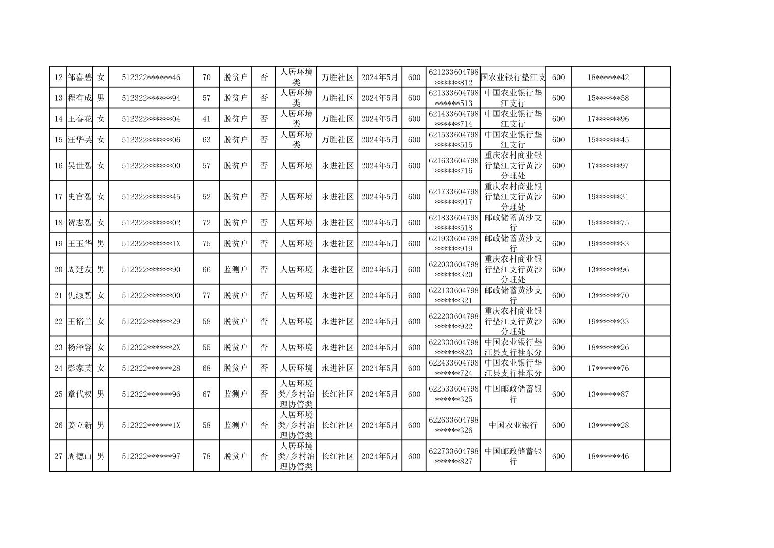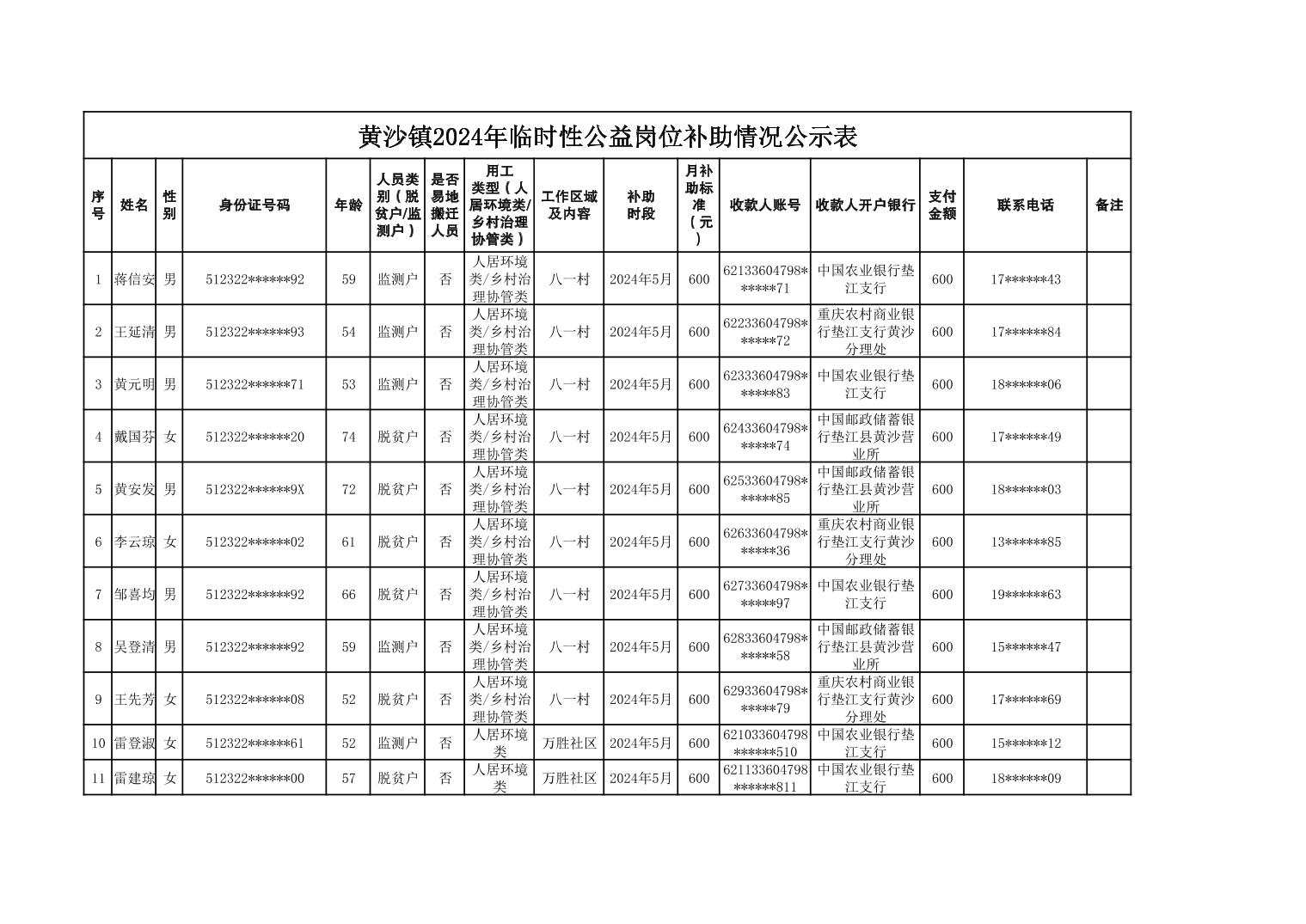 黄沙镇2024年临时性公益岗位补助情况公示表