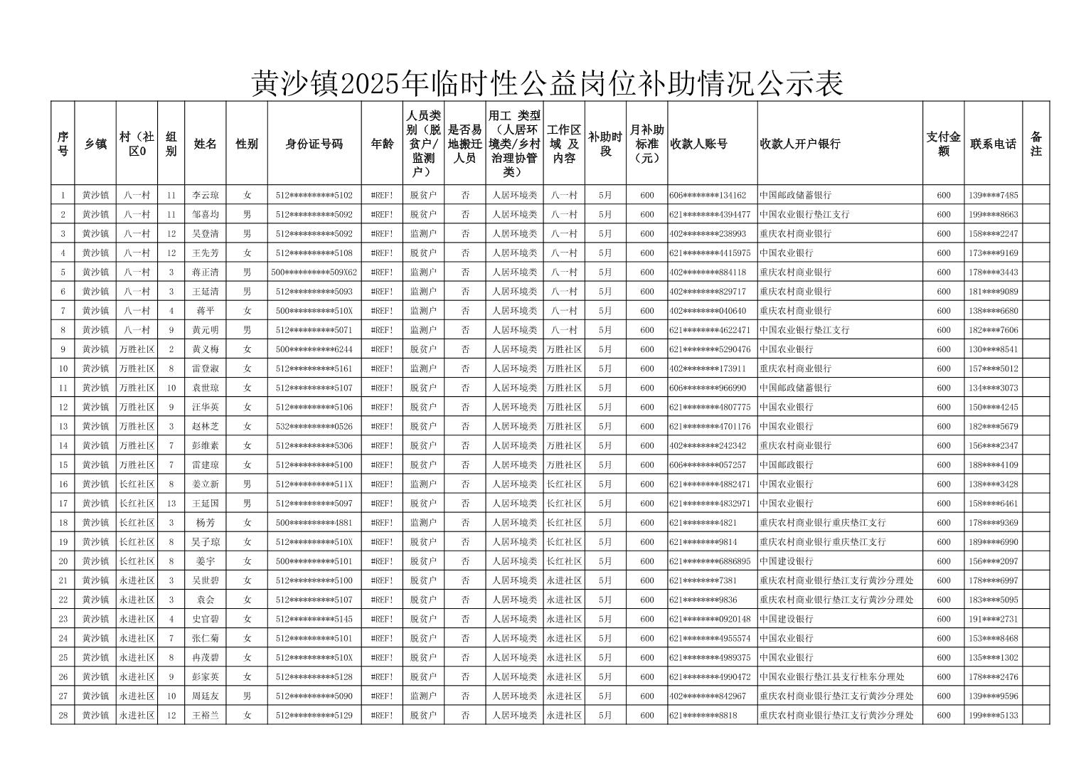 黄沙镇2025年临时性公益岗位补助情况公示表
