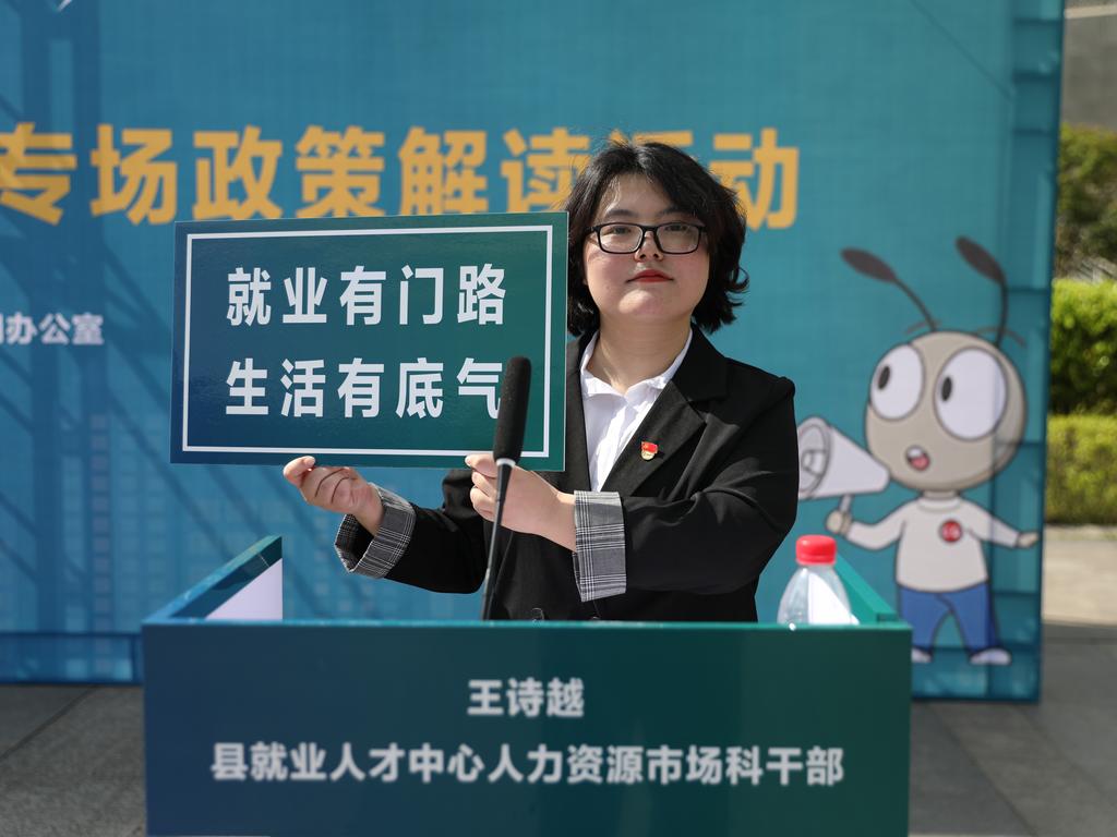 县就业和人才中心人力资源市场科干部 王诗越:今天,我和大家分享的主题是“就业有门路,生活有底气”。长期以来,我们坚持民生至上、就业优先,将稳就业、保就业作为头等大事,紧盯群众“急难愁盼”,打出了一套政策找人、服务上门、兜底保障的组合拳。用实实在在的举措,让劳动者就业有门路、增收有盼头、生活有底气。