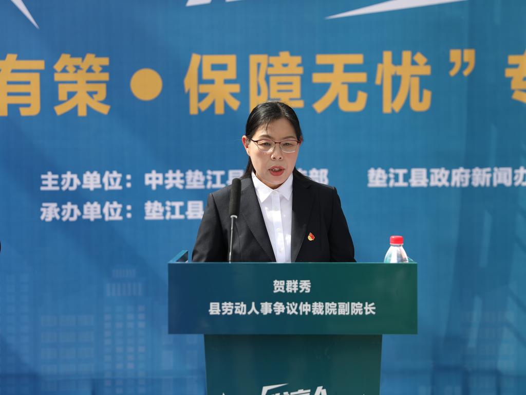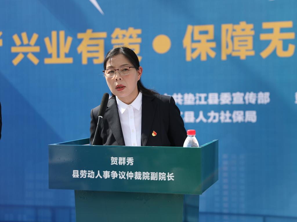 首先,有请县劳动人事争议仲裁院副院长贺群秀女士。