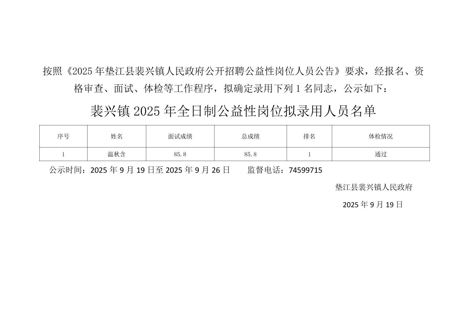 裴兴镇2025年全日制公益性岗位拟录用人员名单公示