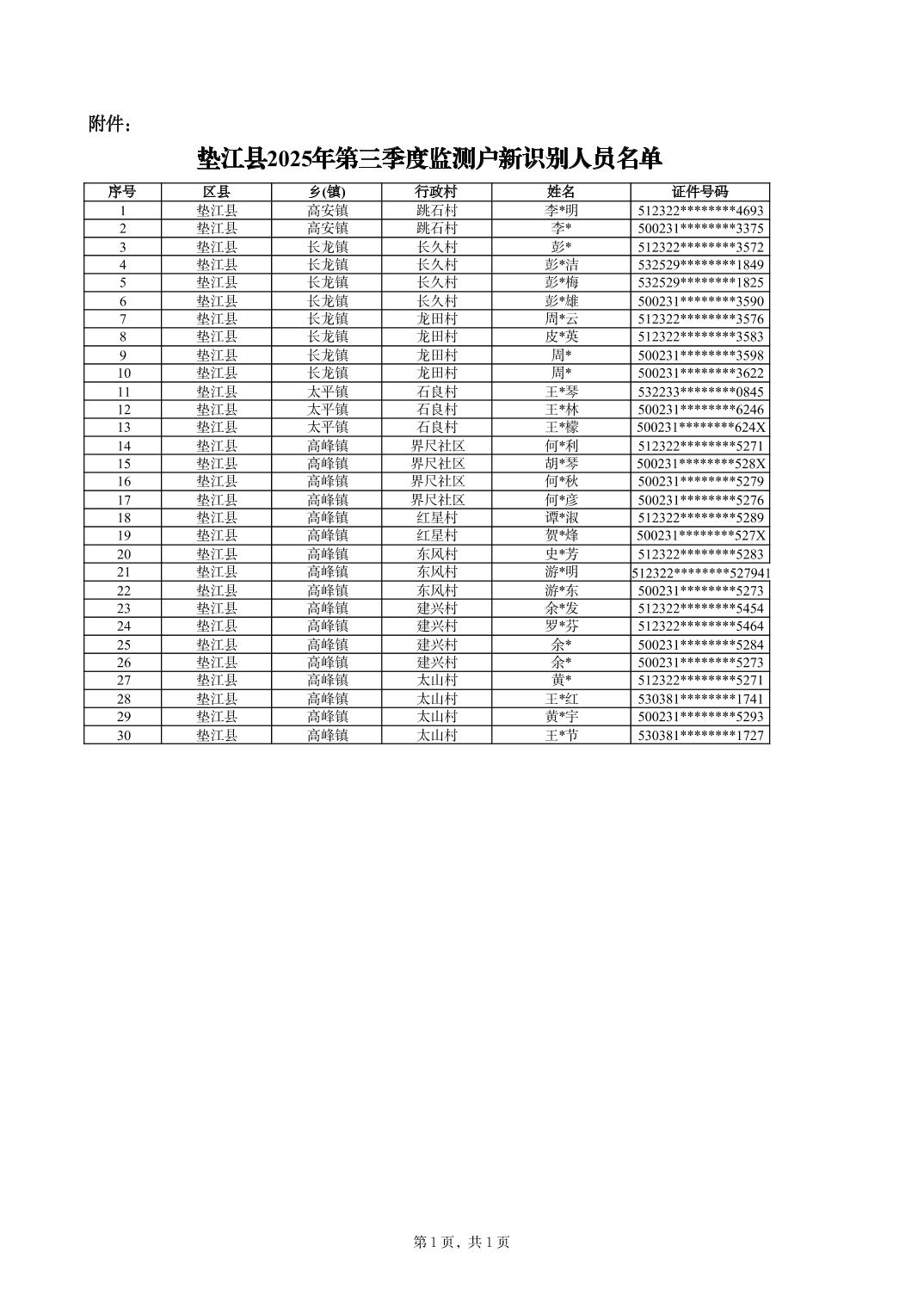 附件:垫江县2025年第三季度监测户新识别人员名单