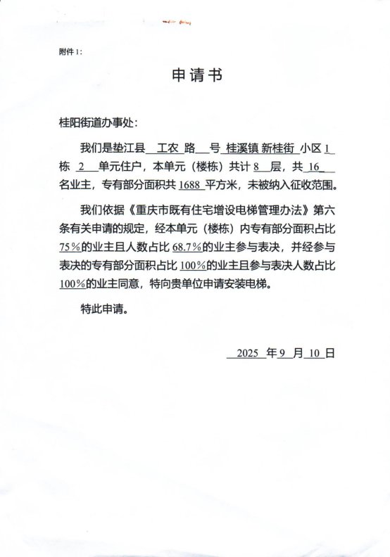 若你单元个人有意见和建议,请注明身份(个人姓名及身份证复印件)、联系电话和邮寄地址,在2025年11月7日前将书面意见等证明涉及其利害关系的材料邮寄或直接提交至垫江县人民政府桂阳街道办事处。逾期未提出的,视为同意增设电梯事宜或自动放弃权利。