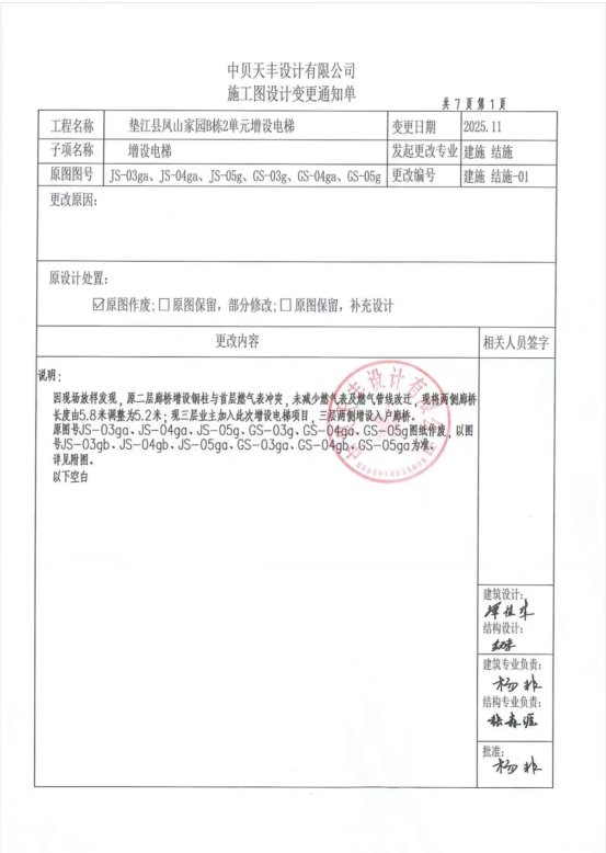 桂阳街道凤山家园B栋2单元位于凤山家园小区内,根据《重庆市既有住宅增设电梯管理办法》,于2025年10月16日通过既有住宅增设电梯联合审查并送达联合审查意见表,因现场放样发现,原二层廊桥增设钢柱与首层燃气表冲突,未减少燃气表及燃气管线改迁,现将两侧廊桥长度由5.8米调整为5.2米:现三层业主加入此次增设电梯项目,三层两侧增设入户廊桥。原2025年9月29日公示的电梯原图号JS-03ga、JS-04ga、JS-05g、GS-03g、GS-04ga、GS-05g图纸作废,其他公示资料不变,现将施工图图纸JS-03gb、JS-04gb、S-05ga、GS-03ga、GS-04gb、6S-05ga变更资料进行现场公示、公开征求利害关系人意见。