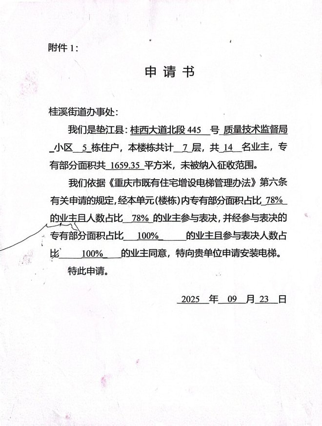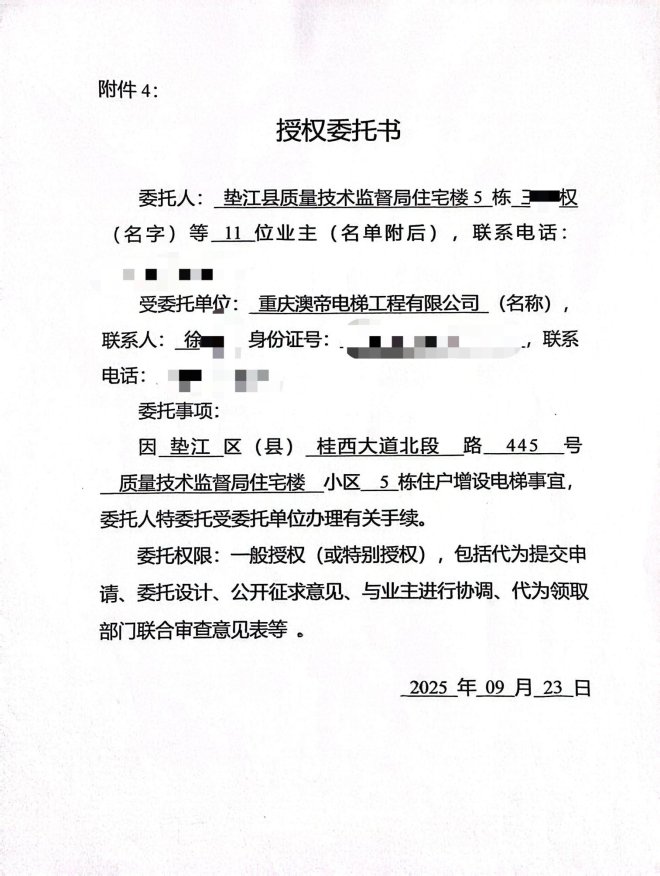 若你单元或个人有意见和建议,请注明身份(个人姓名及身份证复印件)、联系电话和邮寄地址,在2025年12月17日18:00前将书面意见等证明涉及其利害关系的材料邮寄或直接提交至垫江县人民政府桂溪街道办事处。逾期未提出的,视为同意增设电梯事宜或自动放弃权利。