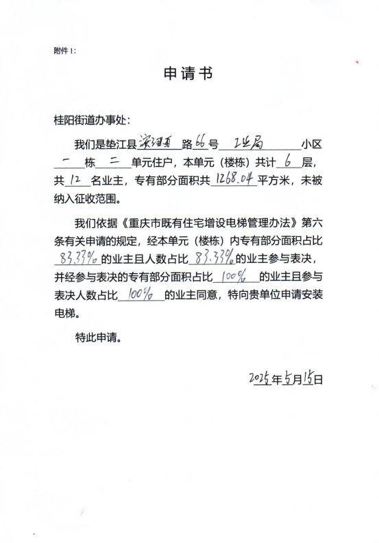 桂阳街道工业局住宅楼二栋二单元和一栋一单元位于工业局住宅楼小区内,根据《重庆市既有住宅增设电梯管理办法》,该单元业主向桂阳街道申请对现有住宅增设电梯,通过对申请资料的审核及既有住宅增设电梯联合审查小组现场踏勘,拟具备增设电梯的条件。现将书面申请书、授权委托书、施工图(总平面图、平面图、立面图、剖面图)、房屋结构安全论证、消防技术标准说明、业主书面同意书、增设电梯费用分担协议,进行现场公示、公开征求利害关系人意见。