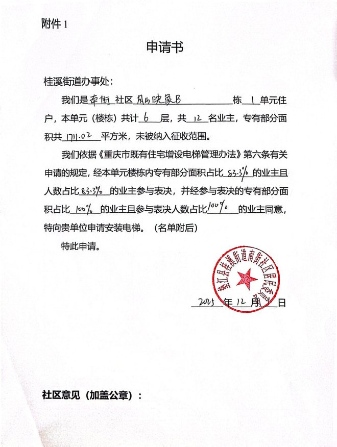 桂溪街道凤山映象B栋1单元位于垫江县凤山映象内,根据《重庆市既有住宅增设电梯管理办法》,该单元业主向桂溪街道申请对现有住宅增设电梯,通过对申请资料的审核及既有住宅增设电梯联合审查小组现场踏勘,拟具备增设电梯的条件。现将书面申请书、授权委托书、施工图(总平面图、平面图、立面图、剖面图)、房屋结构安全论证、消防技术标准说明、业主书面同意书、增设电梯费用分摊协议,进行现场公示、公开征求利害关系人意见。
