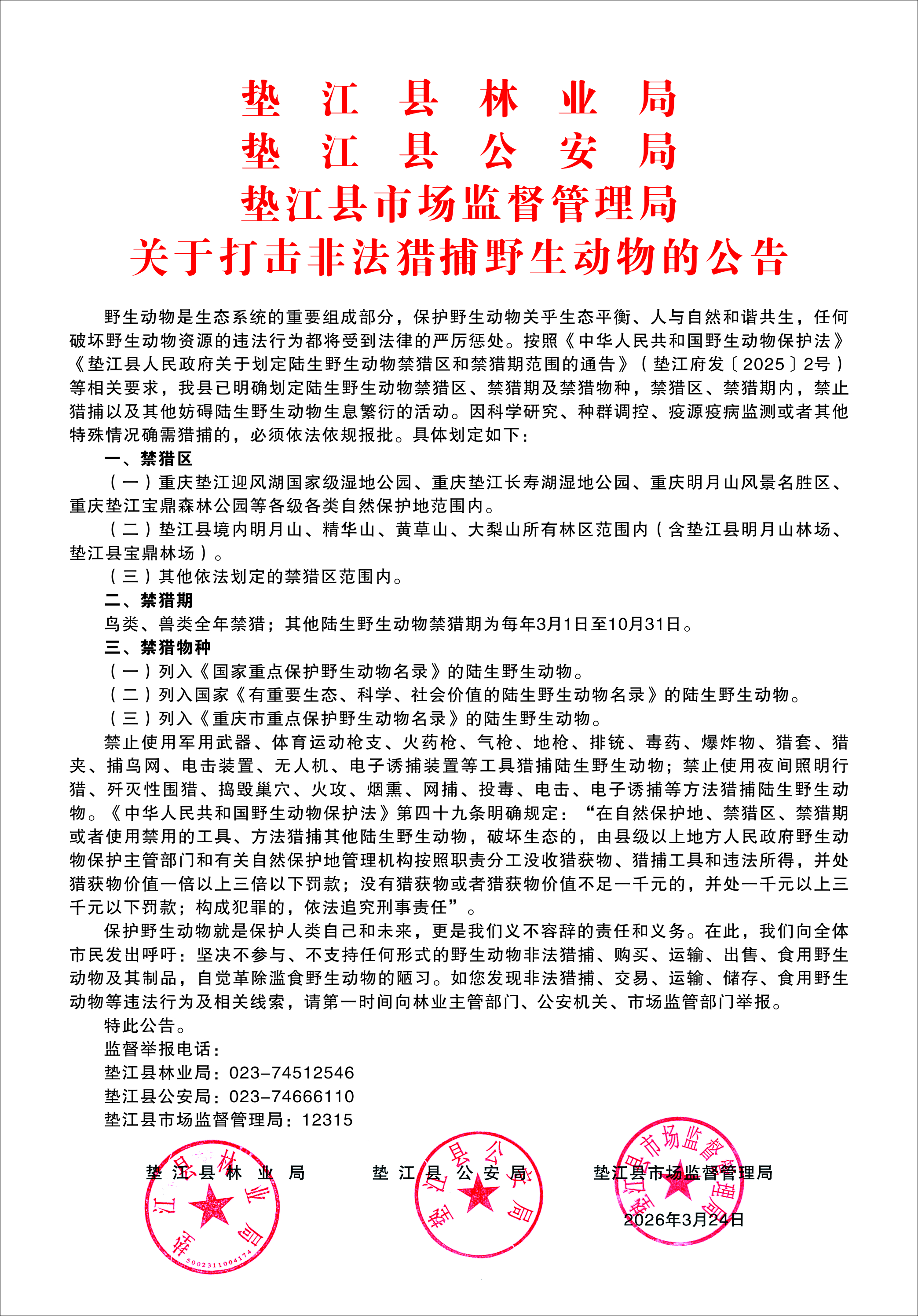 垫江县林业局 垫江县公安局 垫江县市场监督管理局关于打击非法猎捕野生动物的公告