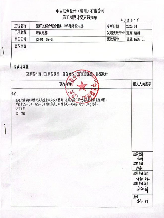 桂溪街道信合综合楼1、2单元位于垫江县信合综合楼内,根据《重庆市既有住宅增设电梯管理办法》,于2026年4月23日进行了既有住宅增设电梯联合审查会,未开工。经考虑到居民出行更加便利的因素,该单元申请电梯业主协商一致后,重新设计变更,在原建筑二层过道处新增设电梯廊桥。原图号JS-04、GS-04图纸作废,以图号JS-04g、GS-04g为准,其他公示资料不变。现将电梯变更资料进行现场公示、公开征求利害关系人意见。