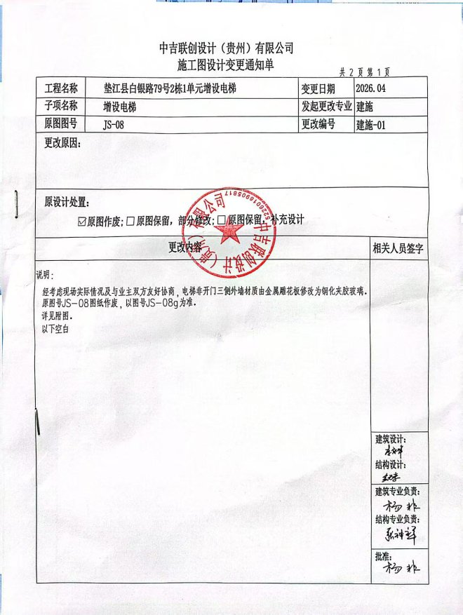 桂溪街道白银路79号2栋1单元位于垫江县白银路79号内,根据《重庆市既有住宅增设电梯管理办法》,于2026年4月23日进行了既有住宅增设电梯联合审查会,未开工。由于原设计电梯外立面与旁边楼栋电梯外立面不一致,不满足风貌要求。经考虑到现场实际情况以及整体风貌因素,该单元申请电梯业主协商一致后,重新设计变更,将电梯非开门三侧外墙材质由金属雕花板修改为钢化夹胶玻璃。原图号JS-08图纸作废,以图号JS-08g为准,其他公示资料不变。现将电梯变更资料进行现场公示、公开征求利害关系人意见。