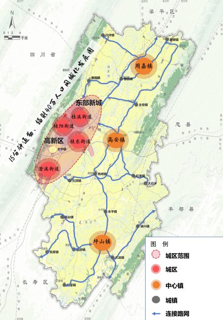 城乡融合发展呈现新面貌。城市“六纵六横”道路体系全面建成,15平方公里东部新城骨架成形。城市更新有序推进,完成老旧小区改造265.4万平方米,拆除县城区建筑物外立面突出防护网和雨棚3.9万余个,人均公园绿地面积提高5.18平方米。乡村振兴全面铺开,巴渝和美乡村达标覆盖率达65%以上,集体经济经营性收入10万元以下的村全部清零。常住人口城镇化率提高3.7个百分点,城乡居民收入比缩小至2:1以内。