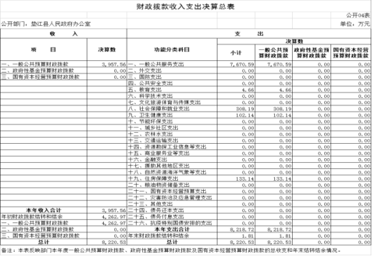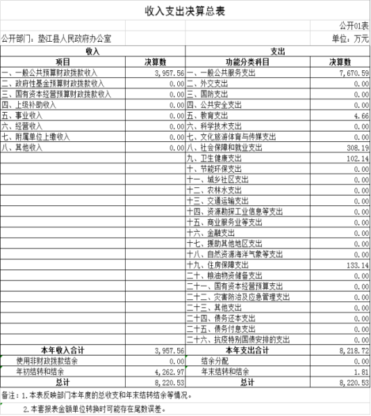 2022年度财政拨款收、支总计8,220.53万元。与2021年相比,财政拨款收、支总计各增加3,088.38万元,增长60.2%。主要原因是一是财政用存量资金追加机关后勤服务中心县级党政机关办公用房经费,二是新增上报决算单位垫江县群众工作服务中心。