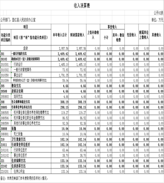 2. 收入情况。2022年度收入合计3,957.56万元,较上年决算数减少1,304.08万元,下降24.8%,主要原因一是减少县府办(本级)和电子政务中心追加文印室设备采购经费、信息化项目评估经费;二是减少机关后勤服务中心项目经费中的综合办公楼、三号楼及档案馆物管费和运行维护费支出;同时,机关后勤服务中心的门市和房屋出租收入、县级机关机要通信与应急保障用车管理服务中心的租车费实行收支两条线,直接解缴国库管理,不再纳入事业收入核算。其中:财政拨款收入3,957.56万元,占100.0%。此外,使用非财政拨款结余0万元,年初结转和结余4,262.97万元。
