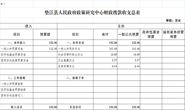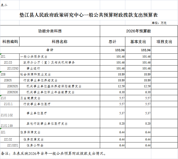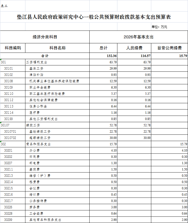 2026年一般公共预算财政拨款收入132.36万元,一般公共预算财政拨款支出132.36万元,2026年为新增预算公开单位。其中:基本支出132.36万元,主要用于保障垫江县人民政府政策研究中心在职人员工资福利及社会保险缴费、离休人员离休费、退休人员补助等,保障部门正常运转的各项商品服务支出。