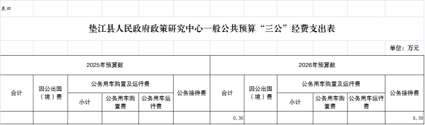 2026年“三公”经费预算0.30万元,比2025年增加0.30万元。其中:因公出国(境)费用0万元,比2025年增加0万元,主要原因是本单位2026年未作安排;公务接待费0.30万元,比2025年增加0.30万元,主要原因是2026年为新增预算公开单位。公务接待费主要用于接待上级部门来垫江调研、各区县来垫江学习交流活动增加;公务用车运行维护费0万元,比2025年增加0万元,主要原因是本单位属事业单位,无保留公务车辆;公务用车购置费0万元,比2025年增加0万元,主要原因是2026年本单位未作预算安排。