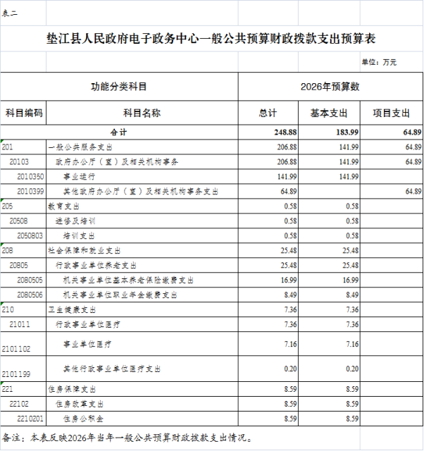 2026年一般公共预算财政拨款收入248.88万元,一般公共预算财政拨款支出248.88万元,比2025年减少133.03万元。其中:基本支出183.99万元,比2025年减少129.40万元,主要原因是2026年年初在职职工9人,比2025年年初16人同比减少7人,减人减少人员经费拨款116.46万元,公用经费拨款年初预算减少12.94万元,主要用于保障垫江县人民政府电子政务中心在职人员工资福利及社会保险缴费、离休人员离休费、退休人员补助等,保障部门正常运转的各项商品服务支出;项目支出64.89万元,比2025年减少3.63万元,主要原因是减少光纤线路接入专项1.02万元、减少电子政务外网等级保护测评2.48万元、减少智慧政务系统软件维护服务2.98万元;增加垫江县电子政务外网核心机房消防器材更换2.00万元、增加公众门户网站租金及维护专项0.85万元。主要用于两个平台光纤接入、智慧政务系统软件维护服务、电子政务外网等级保护测评等重点工作。