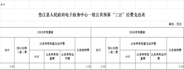 2026年“三公”经费预算0.80万元,比2025年增加0万元。其中:因公出国(境)费用0万元,比2025年增加0万元,主要原因是我中心2026年未作安排;公务接待费0.80万元,比2025年减少0万元,主要用于接待上级部门来垫江调研、各区县来垫江学习交流活动;公务用车运行维护费0万元,比2025年增加0万元,主要原因是我中心属事业单位,无保留公务车辆;公务用车购置费0万元,比2025年增加0万元,主要原因是2026年我中心未作预算安排。