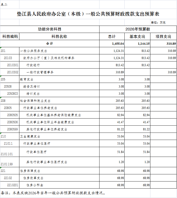2026年一般公共预算财政拨款收入1455.04万元,一般公共预算财政拨款支出1455.04万元,比2025年减少112.37万元。其中:基本支出1144.15万元,比2025年增加17.64万元,主要原因是2026年购买服务人员支出全额纳入年初预算。主要用于保障垫江县人民政府办公室在职人员工资福利及社会保险缴费、离休人员离休费、退休人员补助等,保障部门正常运转的各项商品服务支出;项目支出310.89万元,比2025年减少130.01万元,主要原因是年初预算时政府事务专项减少123.32万元,老年人体育协会专项减少6.69万元。主要用于委托县老体协开展2026年全县老年人体育运动活动、办公室购买服务人员为办公室履职尽责提供保障、保运转等重点工作。