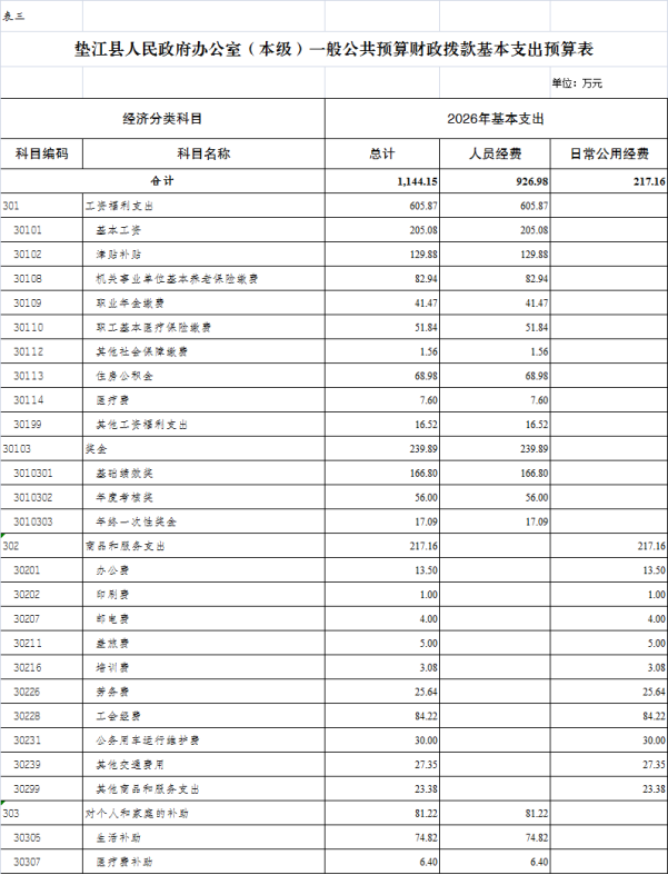 3. 垫江县人民政府办公室(本级)一般公共预算财政拨款基本支出预算表