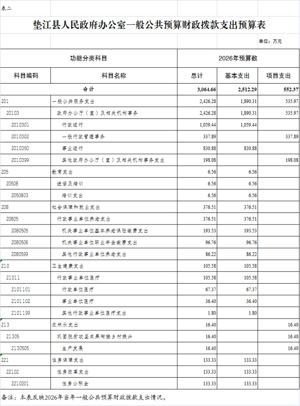 2026年一般公共预算财政拨款收入3064.66万元,一般公共预算财政拨款支出3064.66万元,比2025年增加7.91万元。其中:基本支出2512.29万元,比2025年增加160.56万元,主要原因是2026年购买服务人员经费全额纳入年初预算。主要用于保障垫江县人民政府办公室(本级)、垫江县人民政府电子政务中心、垫江县人民政府政策研究中心、垫江县政务服务中心、垫江县金融发展服务中心、垫江县数字化城市运行和治理中心、垫江县自然灾害预警预防信息中心、垫江县公共资源交易中心在职人员工资福利及社会保险缴费、离休人员离休费、退休人员补助等,保障部门正常运转的各项商品服务支出;项目支出552.37万元,比2025年减少152.65万元,主要原因2026年政府事务经费等专项年初预算减少。主要用于县政府保运转、政务服务、金融服务等重点工作。