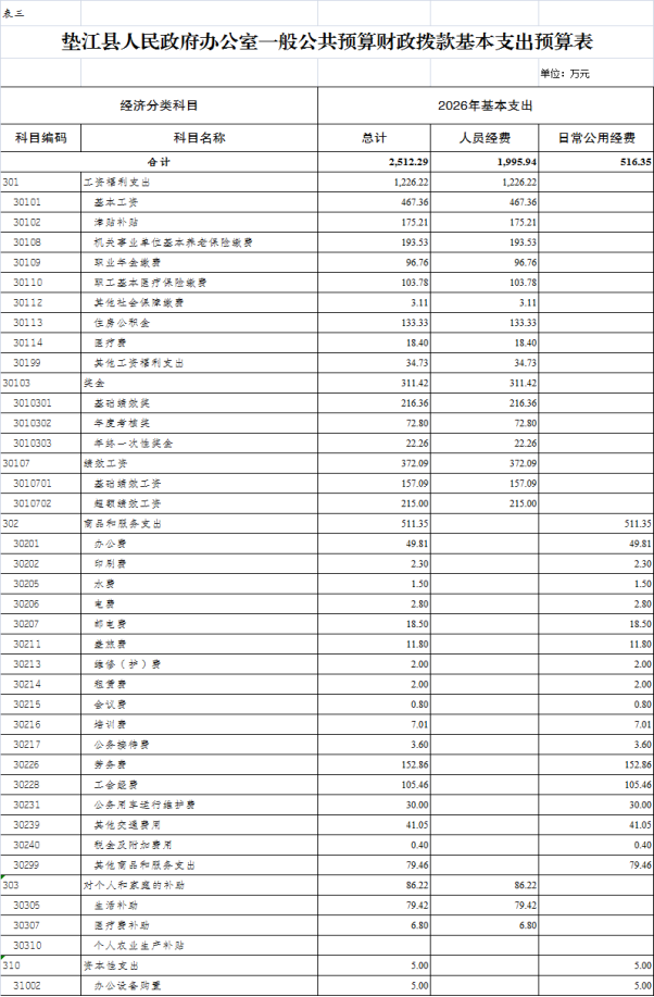 3. 垫江县人民政府办公室一般公共预算财政拨款基本支出预算表
