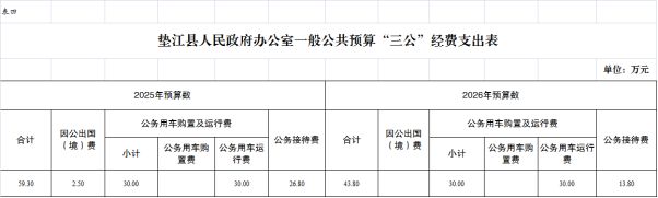 2026年“三公”经费预算43.80万元,比2025年减少15.50万元。其中:因公出国(境)费用0万元,比2025年减少2.50万元,主要原因是2026年未作预算安排;公务接待费13.80万元,比2025年减少13.00万元,主要原因是本部门严格执行中央八项规定,厉行节约,能接待的尽量从简,无接待公函的坚决不接待;公务用车运行维护费30.00万元,比2025年减少0万元;公务用车购置费0万元,比2025年增加0万元;主要原因是2026年本部门暂未安排公务用车购置。