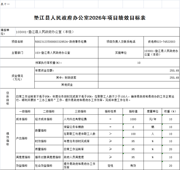 11. 垫江县人民政府办公室2026年项目绩效目标表