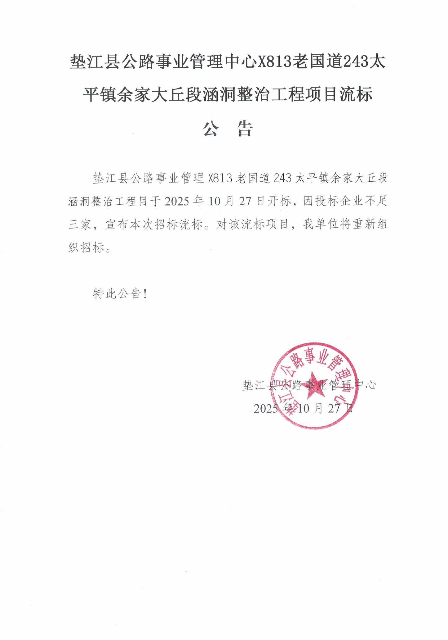 X813老国道243太平镇余家大丘段涵洞整治工程流标公告