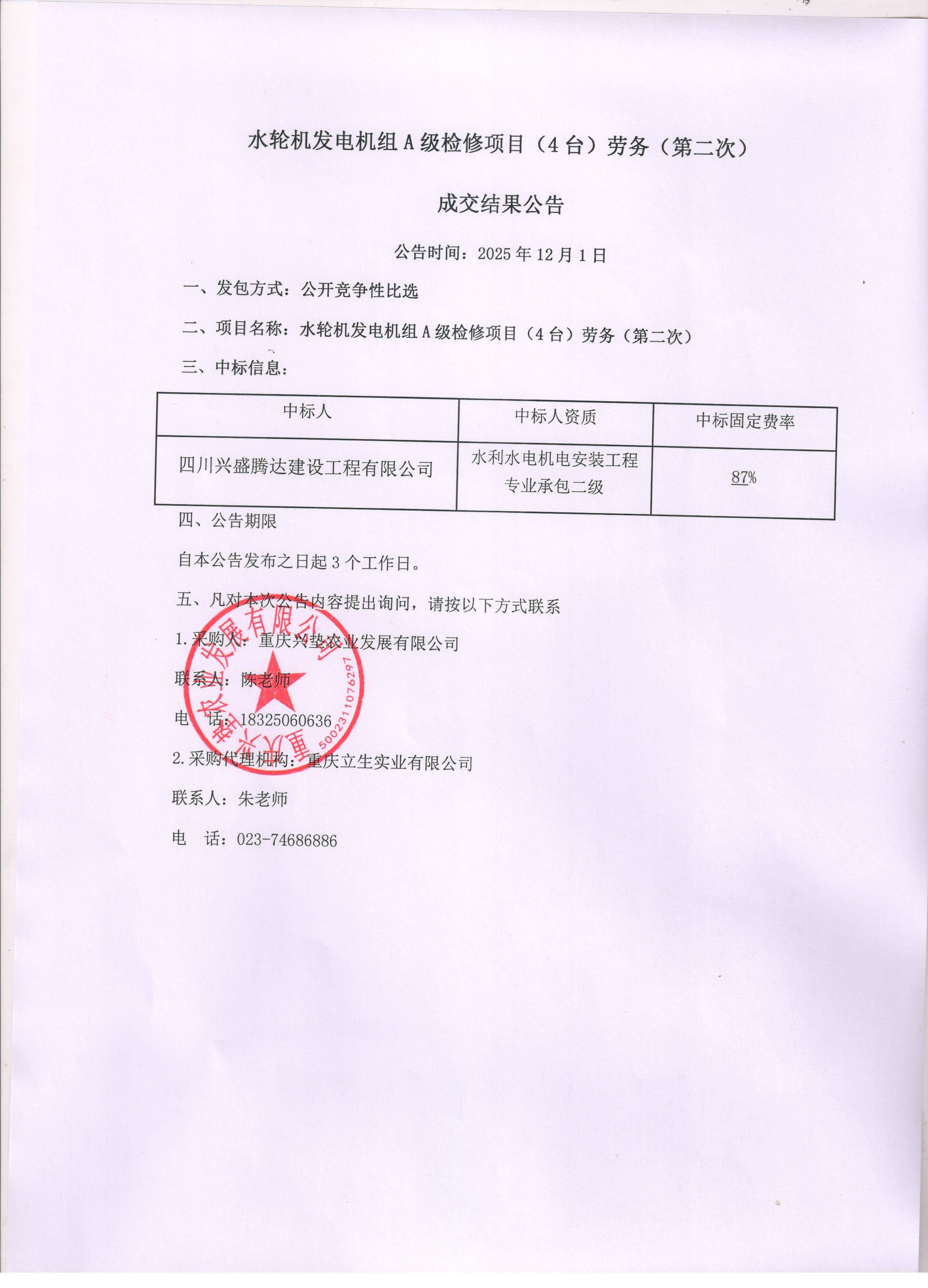 水轮机发电机组A级检修项目(4台)劳务(第二次) 成交结果公告