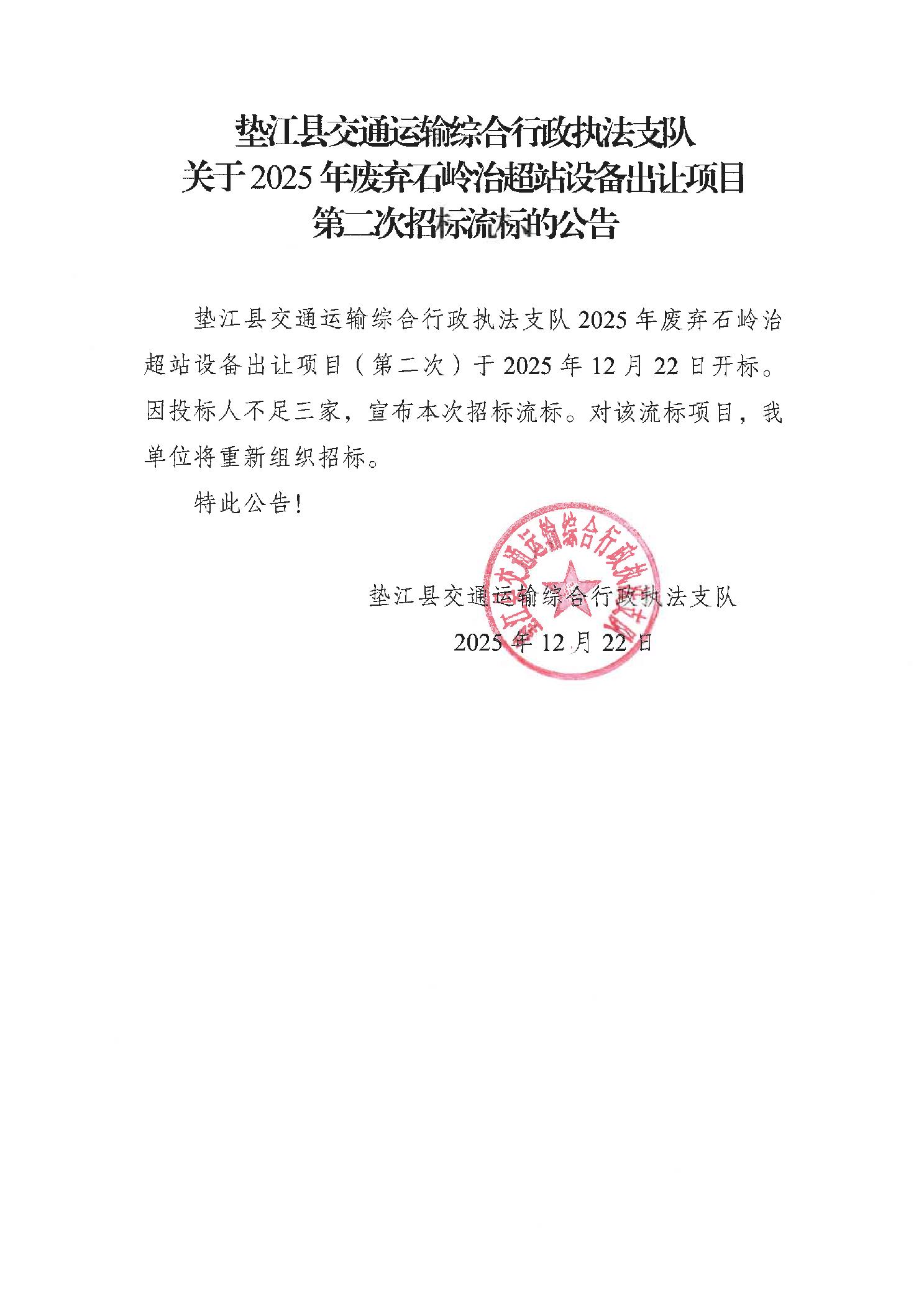 垫江县交通运输综合行政执法支队2025年废弃石岭治超站设备出让项目第二次招标流标的公告