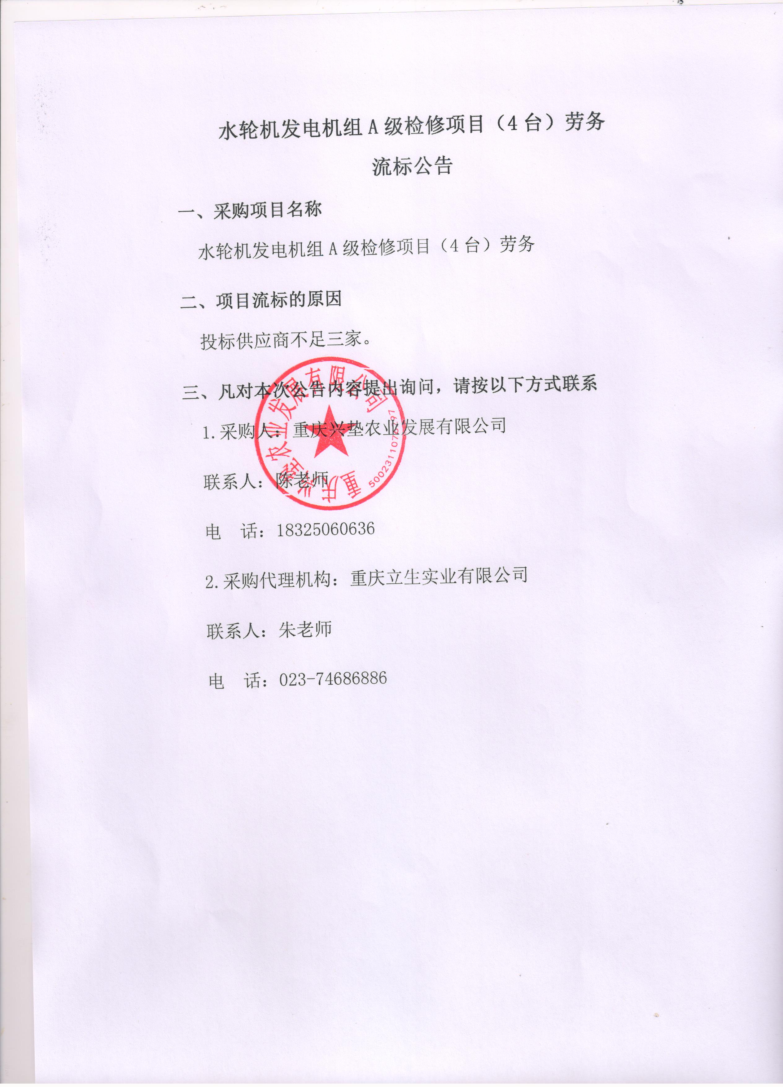水轮机发电机组A级检修项目(4台)劳务 流标公告